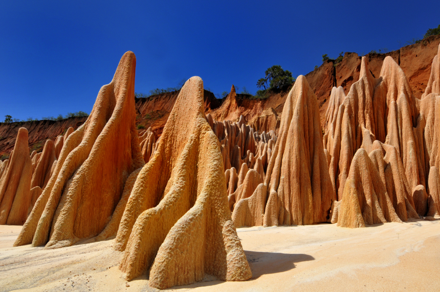 ⦿ The Red Tsingy is formed from red laterite mixed with ancient sand deposits. Over centuries, heavy rainfall, wind and the softness of the soil have carved striking ravines and eroded the clay, revealing tall, delicate columns of sand tinged with red. The result is a surreal landscape of towers and pinnacles, often described as resembling a forest of crimson chimneys.